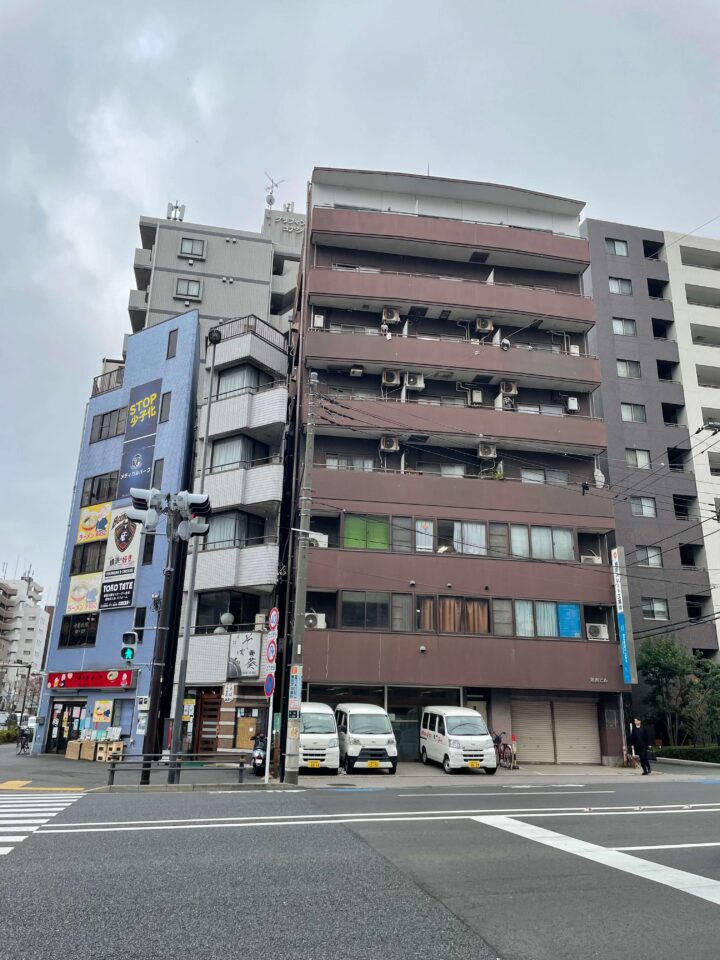 「西平沼」の交差点で見える茶色いビルが湘南ビルです。