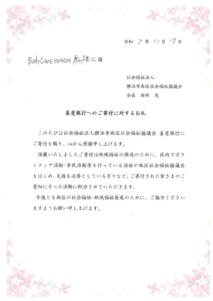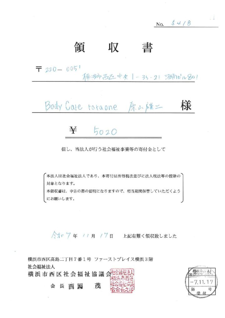 皆様からお預かりした募金等、5,020円は社会福祉法人横浜市西区社会福祉協議会に寄付致しました。